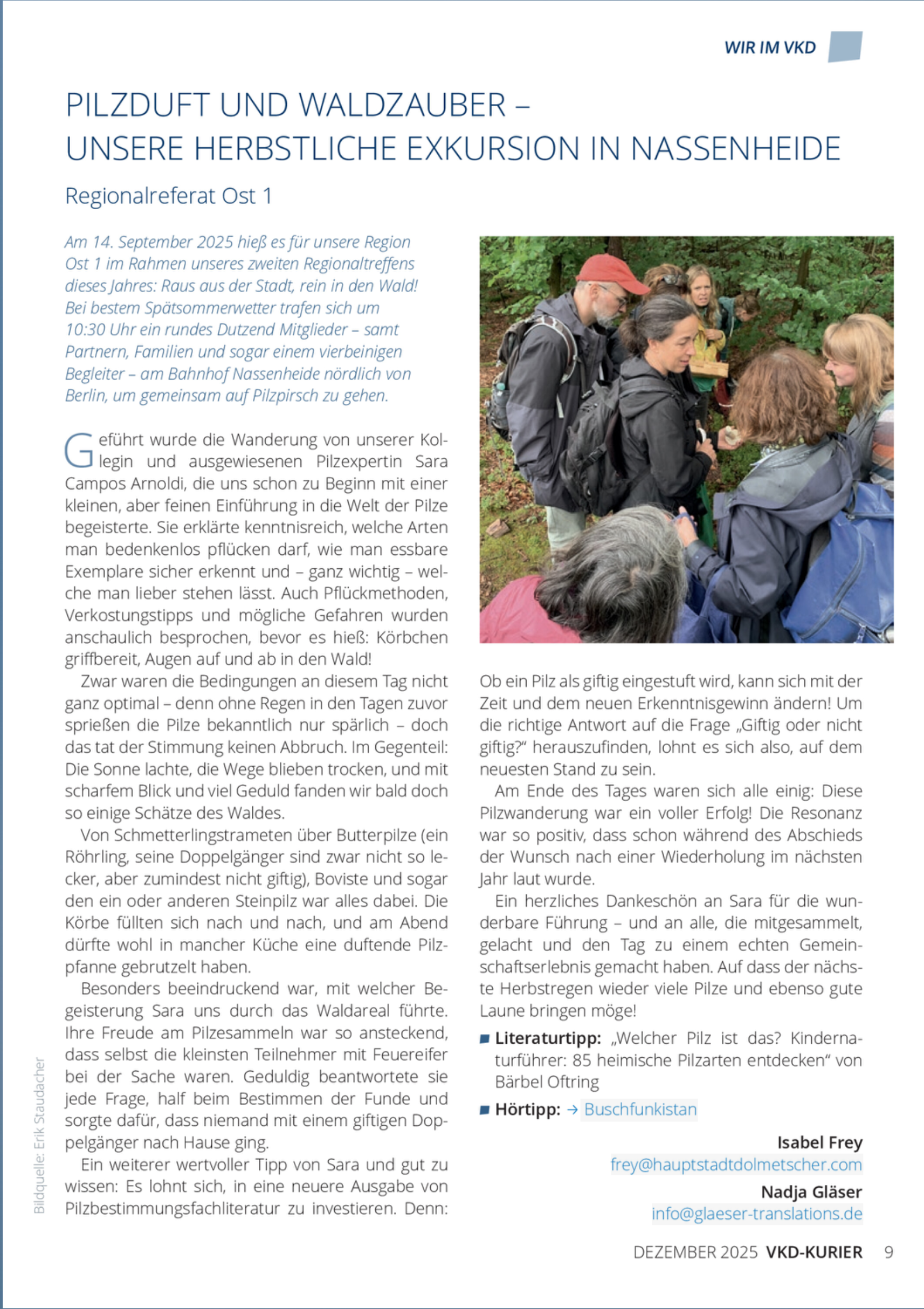 Im Herbst 2025 war unser d-interp-Mitglied Sara Campos Arnoldi ausnahmsweise nicht als Konferenzdolmetscherin, sondern als Exkursionsführerin und Pilzexpertin unterwegs. Für den Berufsverband VKD weihte sie ein gutes Duzend Verbandsmitglieder in die Geheimnisse der Pilzsuche ein. Hier der Bericht aus der verbandsinternen Mitgliederzeitschrift, dem VKD-Kurier: